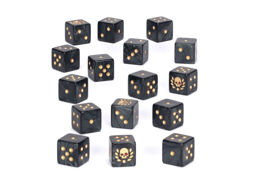 This is a set of 16 six-sided dice with squared edges for use in games of Warhammer 40,000, themed around Commissar Yarrick. They are cast in pearlised black acrylic plastic with gold and metallic red ink markings, and measure 16mm along each edge. The 1-5 facings are traditionally pipped, and each '6' face is decorated with the inspirational icon of Commissar Yarrick. These themed dice are only available while stocks last.