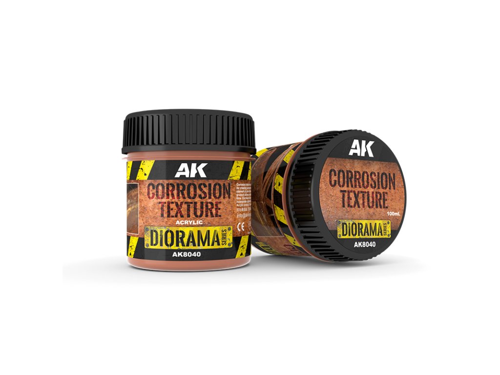 Korozní textura je akrylový produkt, který byl formulován pro vytváření povrchových textur, jako je koroze na vozidlech nebo jakémkoli prvku vašich dioramat a vinět. Složení tohoto produktu umožňuje pokaždé extrémně realistické, v měřítku správné textury. Korozní textura se nejlépe aplikuje v tenké vrstvě, po zaschnutí zapracujte pigmenty pro chromatičtější tóny.