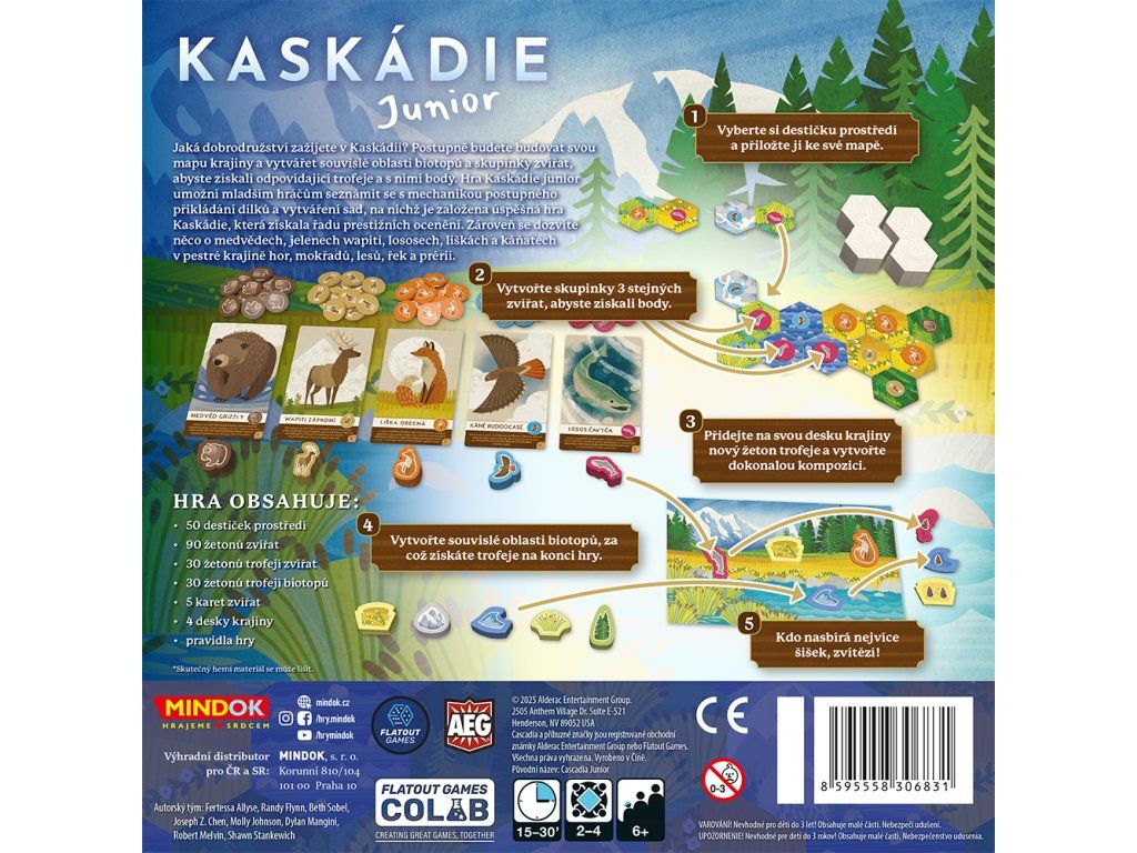Vítejte v divoké přírodě severozápadní Ameriky! Kaskádie Junior je přístupná a graficky nádherná rodinná hra, ve které se stanete architekty vlastní krajiny. Vaším úkolem je skládat k sobě destičky různých biotopů a osidlovat je ikonickými zvířaty tak, aby vaše přírodní rezervace vzkvétala a přinesla vám co nejvíce vítězných bodů v podobě šišek.