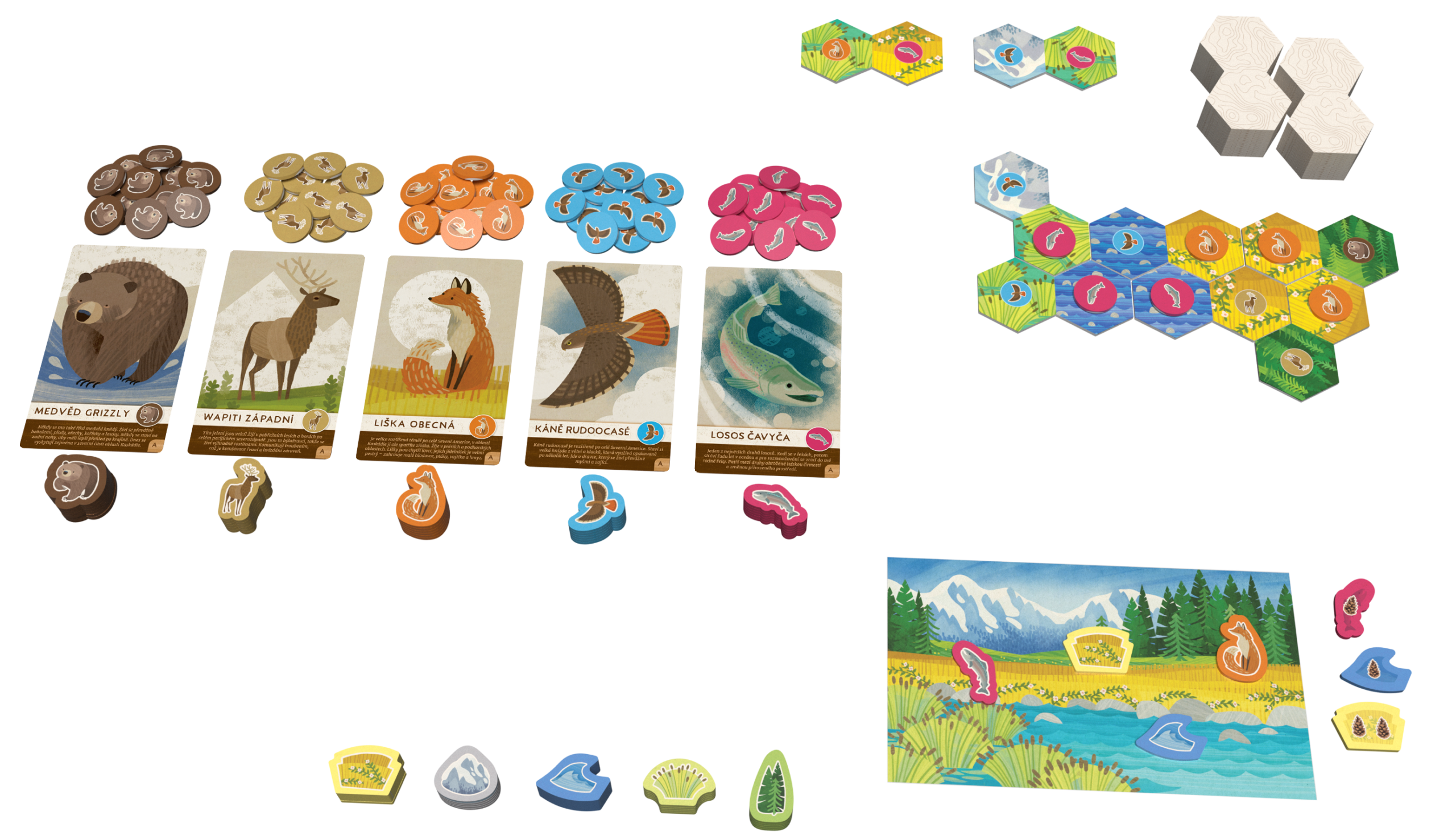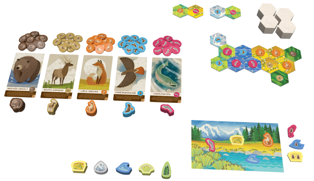 - Nádherné zpracování: Hra obsahuje ilustrované karty a žetony s pěti druhy zvířat – od majestátního grizzlyho po mrštného lososa.