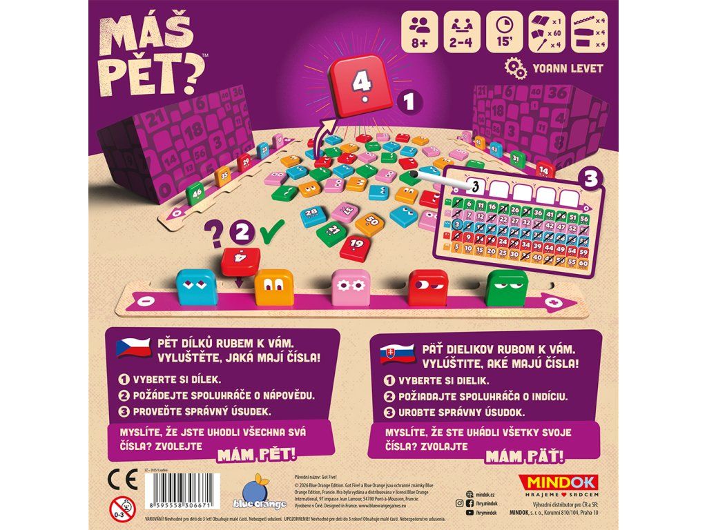 Hledáte hru, která pořádně provětrá vaše mozkové závity a prověří vaši schopnost dedukce? Máš pět? je napínavá logická hra, ve které se snažíte jako první odhalit pět svých skrytých čísel. Háček je v tom, že zatímco vy svá čísla nevidíte, vaši soupeři ano. Pomocí chytrých otázek a postupného vylučování možností musíte sestavit správnou kombinaci dříve než ostatní.