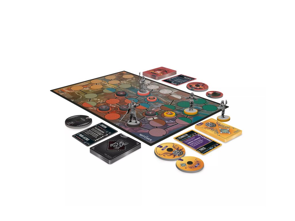Hra Unmatched Zaklínač - Pád říší obsahuje: 4 figurky, 6 žetonů pomocníků, 5 ukazatelů zdraví, 94 karet, 1 oboustranný herní plán, pravidla v českém jazyce.
