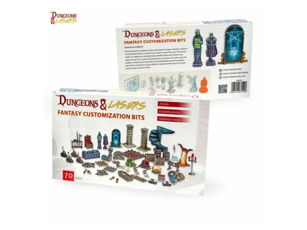 Dungeons & Lasers je systém modulárních terénů pro RPG – hry na hrdiny. Komponenty jsou postaveny na gridu, který odpovídá měřítku pro hraní 5. edice D&D, Jeskyní a draků a všech kompatibilních her. Informace pouze v anglickém jazyce. Výrobek není určený dětem, nejedná se o hračku.