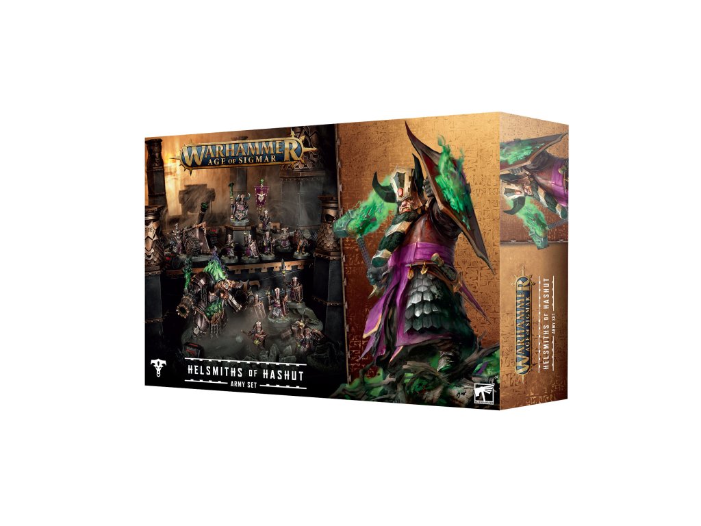 – Chaos Battletome: Helsmiths of Hashut, a 90-page hardback book with a soft-touch cover and artwork unique to this boxed set