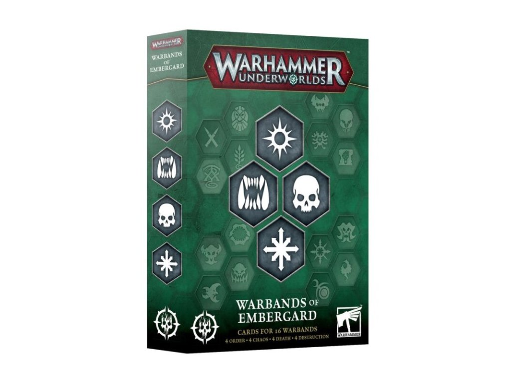 This box collects fighter cards and warscroll cards for 16 Warhammer Underworlds warbands, allowing you to unleash the existing miniatures from your collection in the mines beneath Embergard.